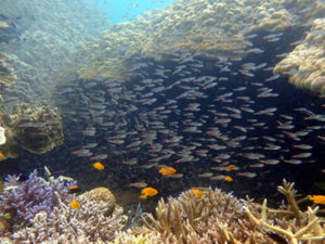 スカシテンジクダイを狙うハナミノカサゴの若者