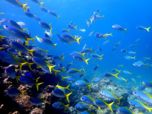 ミカヅキツバメウオがとっても人懐っこくダイバーの周りをうろうろと