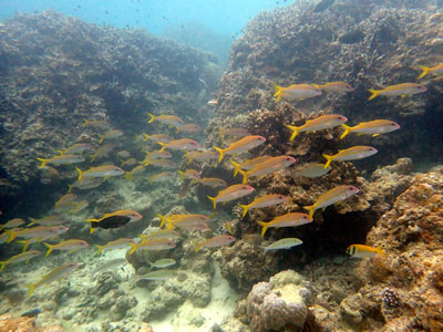 彩映えるアカヒメジの群れやハマクマノミも
